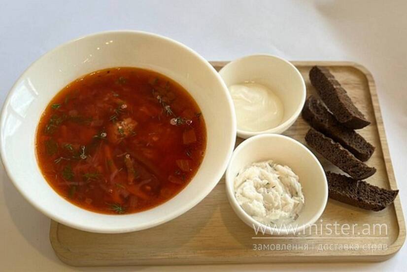 Український борщ з салом, сметаною та смачними житнім хлібом.