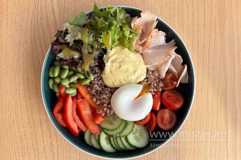 Ніжна печена індичка з гречкою на вершковому маслі — основа цього корисного боулу. Яйце для білка, едамаме для хрусту, свіжі овочі для вітамінів. Медово-гірчичний соус додає пікантності кожному шматочку. Коли треба поєднати користь і задоволення.