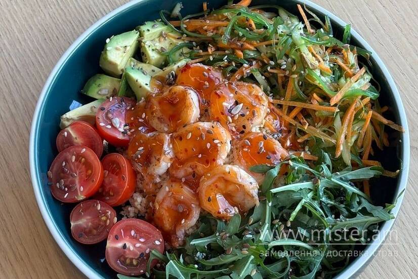 Соковиті креветки, обсмажені з часником, тим’яном та коріандром на запашній олії. У поєднанні з кус-кусом, кремовим авокадо, свіжими огірками, морквою, чері, руколою та міксом хрусткого салату. Морська чука та пікантний соус світ-чілі.