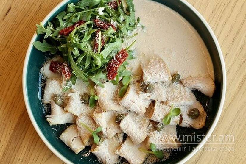 Тонко нарізана індичка в поєднанні з ніжним соусом тоннато, пряною руколою, в`яленими томатами та каперсами. Посипається витриманим пармезаном, заправляється оливковою олією та прикрашається свіжим мікрогріном.