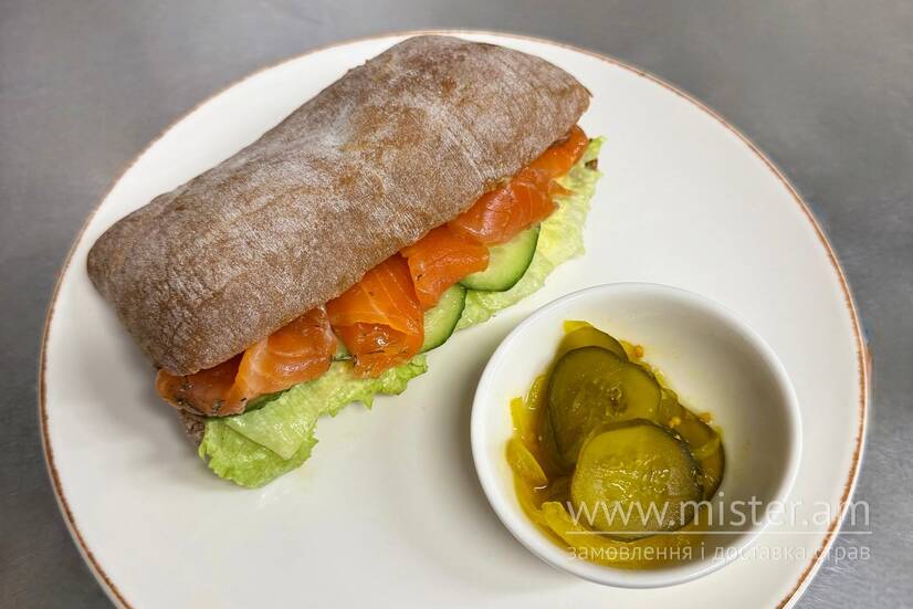 Чіабата темна, соус тар-тар, лосось слабосолений, огірок свіжий, салат Айсберг, огірки "bread & butter".