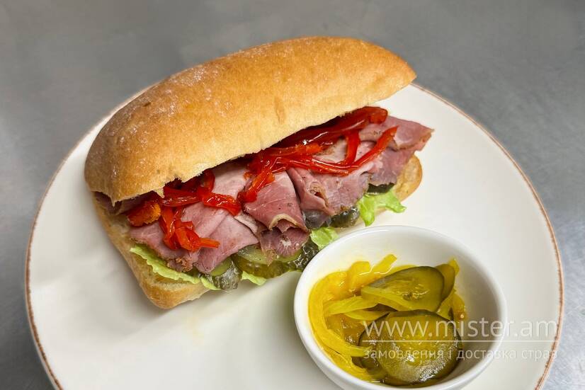 Чіабата світла, пастрамі з яловичини, соус гірчичний, огірок солоний, перець карамелізований, салат Айсберг, огірки "bread & butter".