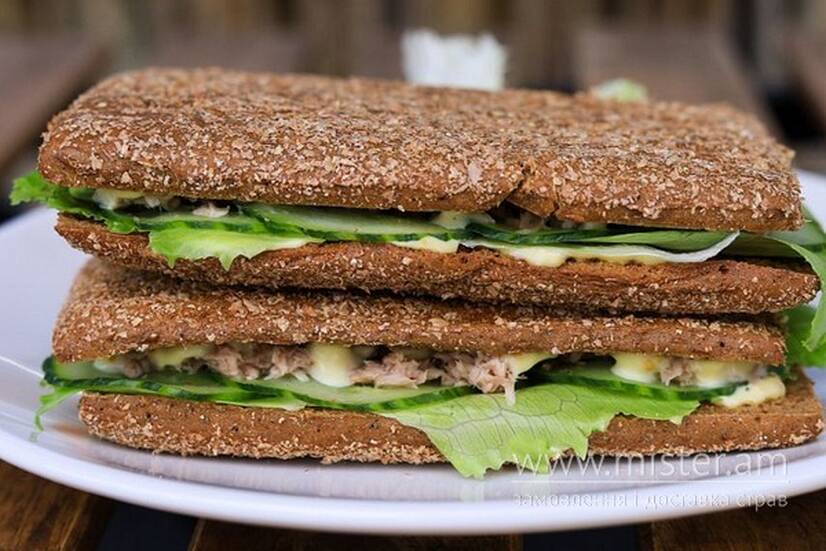 Хліб фінський, соус гірчичний, салат айсберг, огірок, тунець консервований.