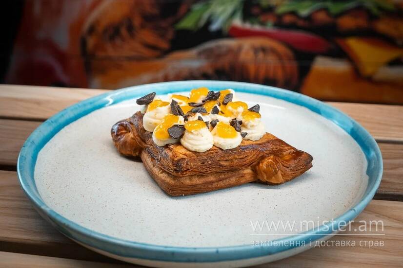 Дуже цитрусовий даніш з апельсиновим кремом та апельсиновим джемом, посипаний крихтою гіркого шоколаду.