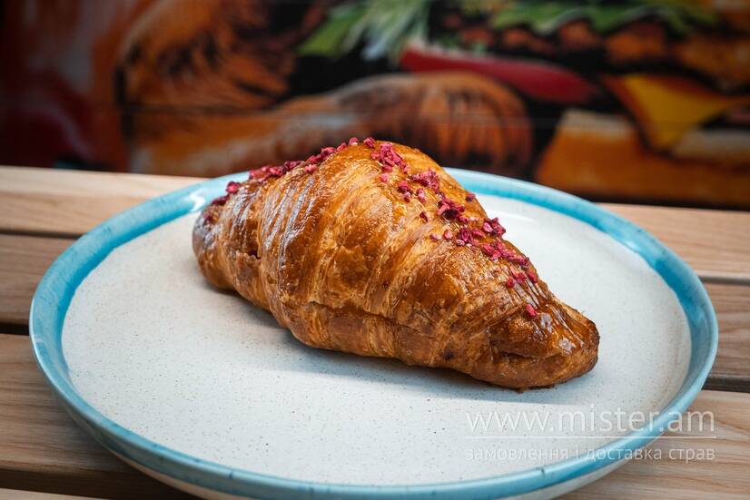 Хрусткий круасан, просочений цитрусовим сиропом з мигдалевим кремом у поєднанні з цілими ягодами кисло-солодкої малини.
