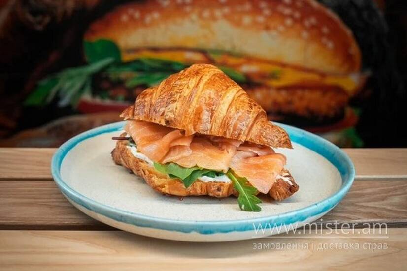 Круасан, лосось слабосолений, крем-сир, мікс салату.