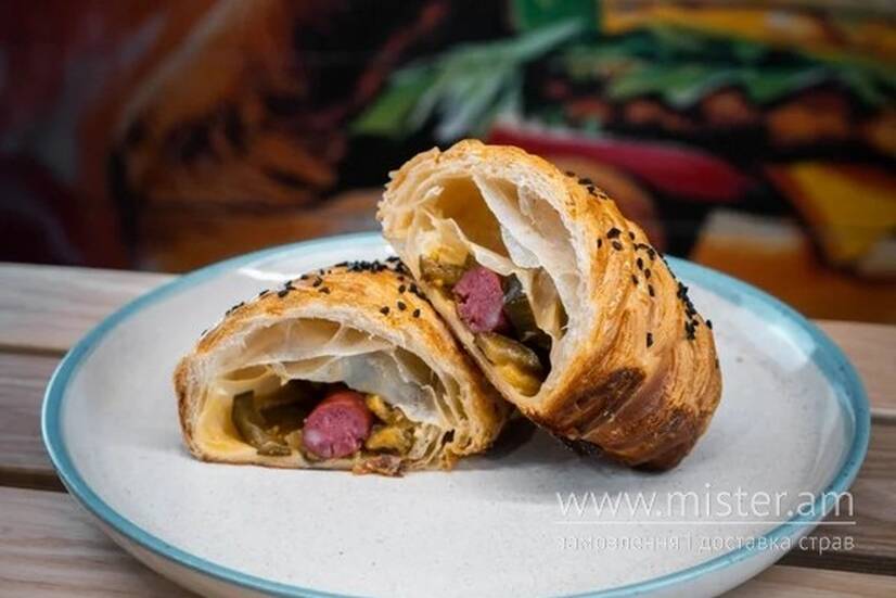 Хрумке листкове тісто з копченою сосискою та маринованими огірочками.