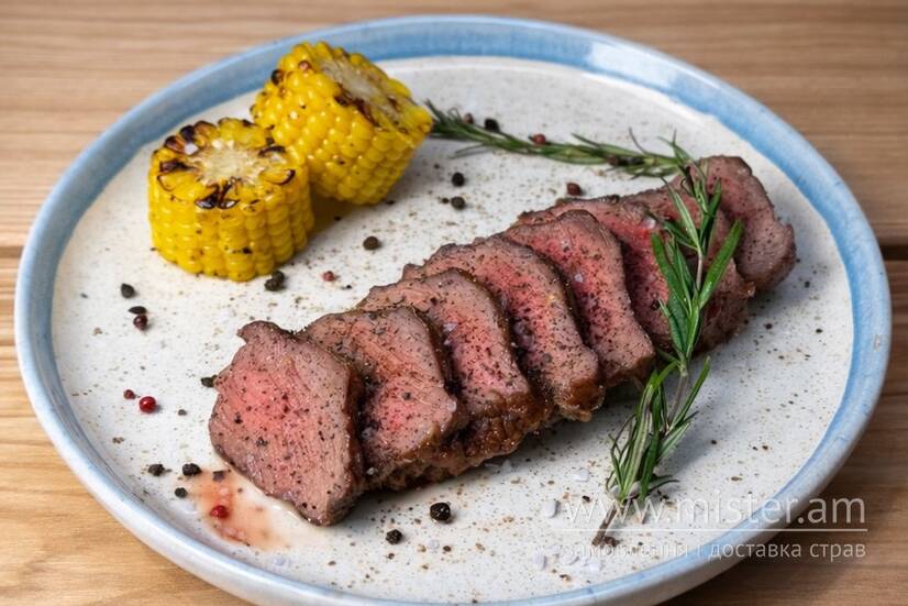 Стейк Рібай, кукурудза, вершкове масло, розмарин, сіль, оливкова олія, суміш перців. Вага м`яса вказана в сирому вигляді.