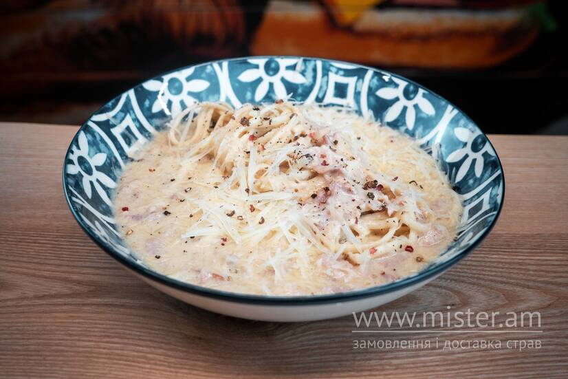 Паста на вибір, бекон, пармезан, яєчний жовток, бульйон курячий, вино біле, часник конфі, суміш свіжозмелених перців.
