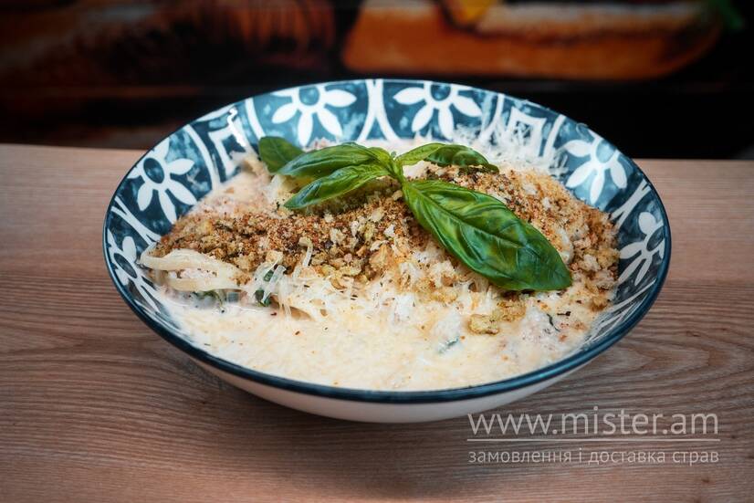 Паста на вибір, фарш індички, вершки, бульйон курячий, пармезан, цибуля шалот, вино біле, часник конфі, базилік, хлібна крихта з базиліком.