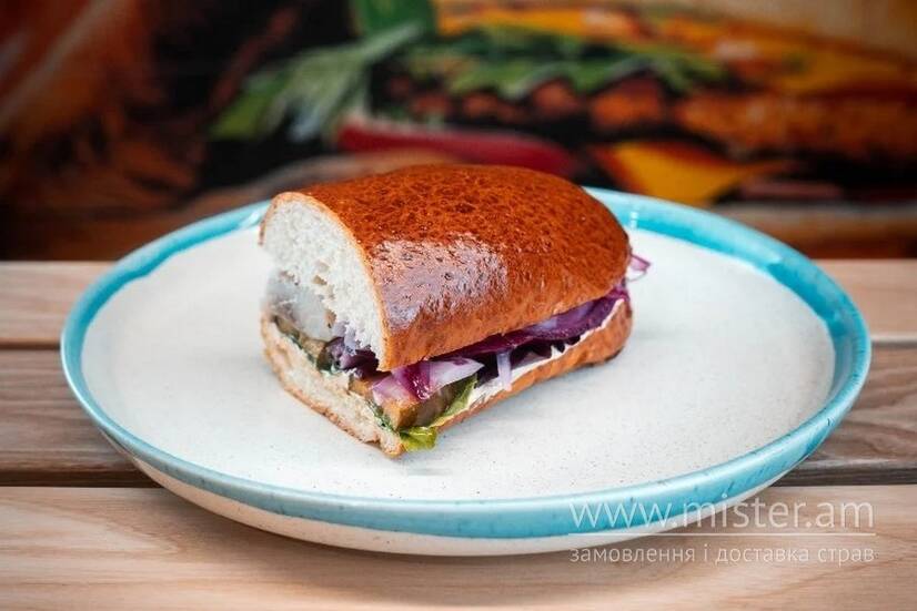 Бріош, філе оселедця, мариновані огірки, маринована цибуля, бите місо масло, суміш спецій.