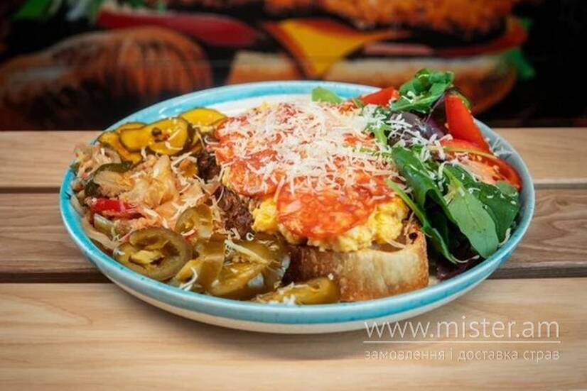 Скибка хліба на вибір, скрембл із двох яєць, мікс салату, соус сирний гудбрандсдален, томат свіжий, огірок маринований, кімчі, маринований халапеньо, салямі папероні, сир грана падано, оливкова олія, сіль, суміш свіжозмелених перців.