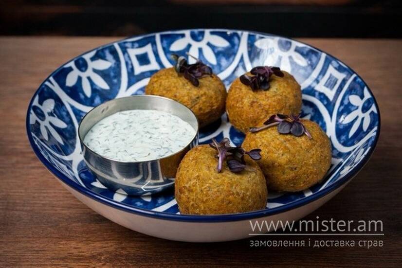 Це поєднання хрустких, ароматних кульок із нуту, спецій та зелені, які подаються теплими з освіжаючим соусом на основі грецького йогурту, створюючи контраст між пряним, насиченим фалафелем та прохолодною вершковою кислинкою соусу.
