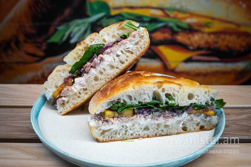 Фокача із консервованим тунцем, крем-сиром, маринованими огірками, маринованою цибулею, мікс салату, суміш спецій.