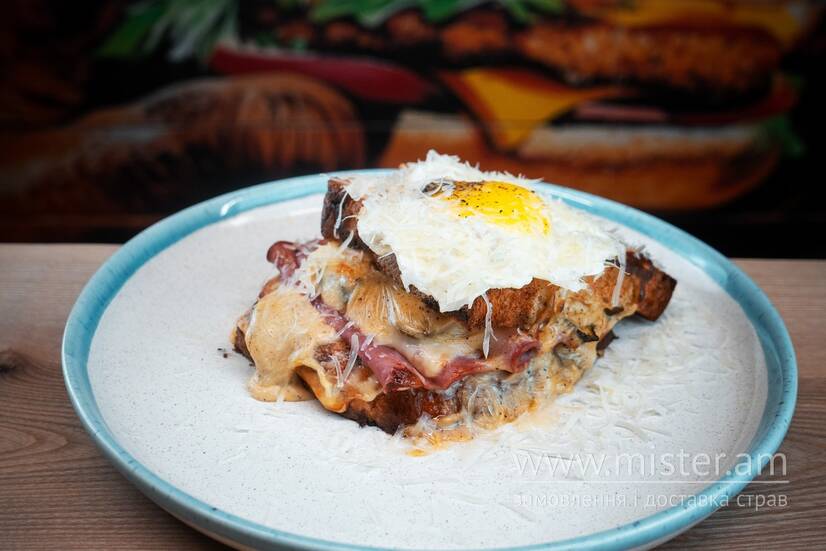 Бріош, соус бешамель, полтавська шинка, мариновані огірки, сир гауда, пармезан, яйце куряче.
