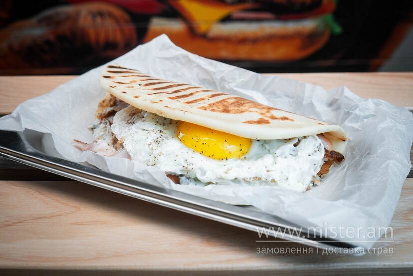Піта, курча гриль, яйце смажене, карамелізована цибуля, соус грецький.
