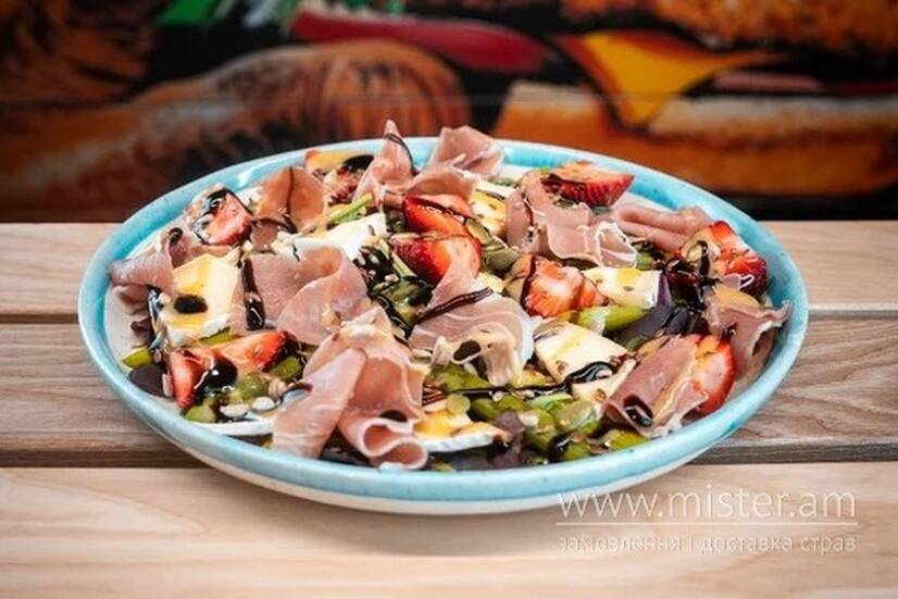 Спаржа, полуниця свіжа, прошуто, мікс салат, сир брі, соус медово-гірчичний, крем бальзамічний, насіння соняшника, гарбуза, льону.