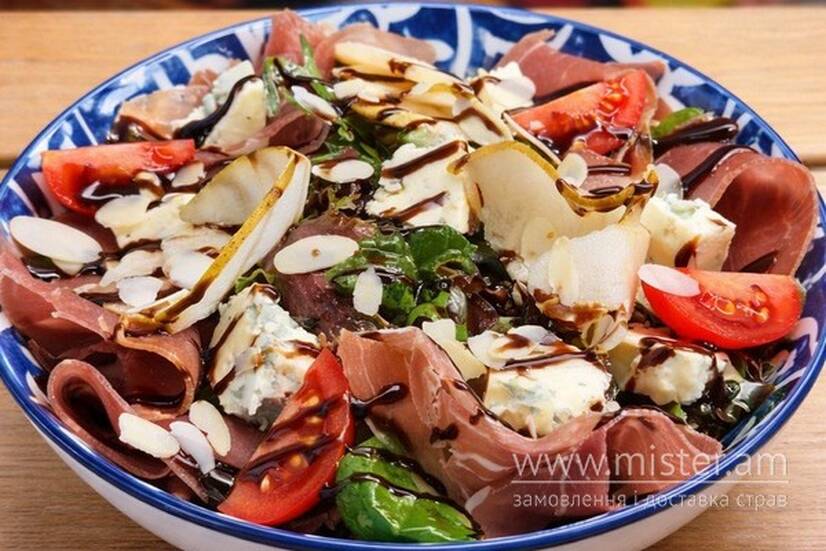 Це вишукана страва, що поєднує прошуто з пікантним сиром дорблю з додаванням солодкої груші, свіжих томатів, мікс салату та мигдалевих пластівців, заправлених оливковою олією, соусом бальзамік.