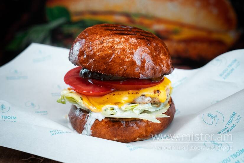 Булочка бріош, фарш індички, мариновані огірки, маринована слива, томат свіжий, соус грецький, салат айсберг, сир чеддер, кетчуп, суміш спецій + картопляні дольки.