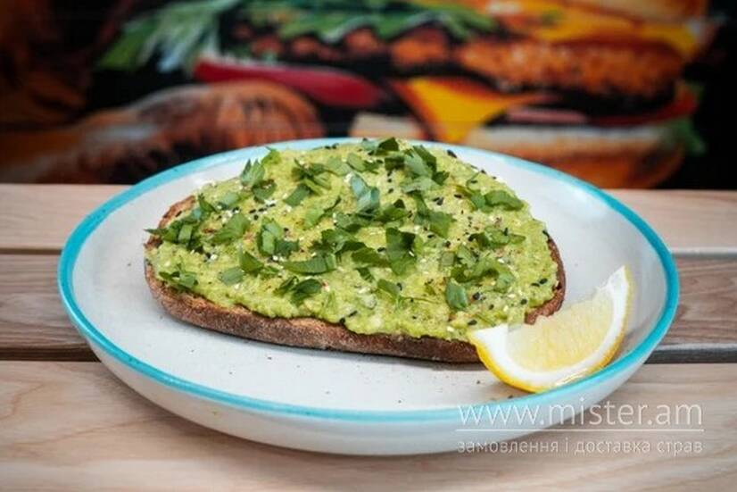 Скибка хліба на вибір, соус гуакамоле, лимон, петрушка, кунжут, мікрозелень, перець чилі пластівці.