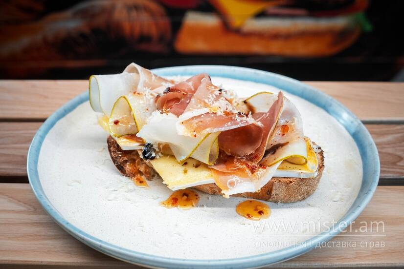 Скибка хліба на вибір, сир брі, прошуто, груша, гострий мед, сир Dziugas, суміш спецій.