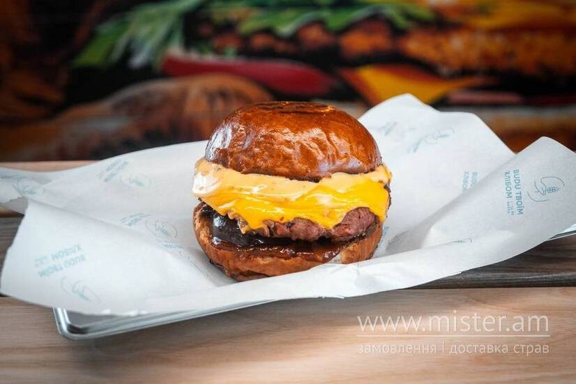 Булочка бріош, котлети Eat me at на рослинній основі, цибуля карамелізована, сир чеддер, соус BBQ espresso, соус сирний гудбрансдален, мариновані огірки, суміш спецій.