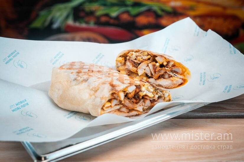 Піта, курча гриль, яйце куряче, соус сирний гудбрандсдален, грудинка, огірок маринований, гірчиця американська.
