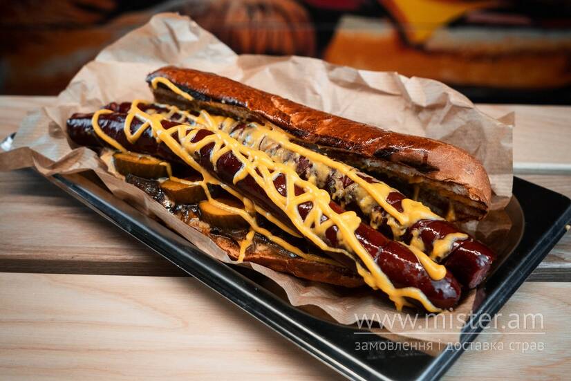 Булочка бріош, дві напівкопчені сосиски, карамелізована цибуля, соус сирний гудбрансдален, мариновані огірки, гірчиця американська, суміш спецій.