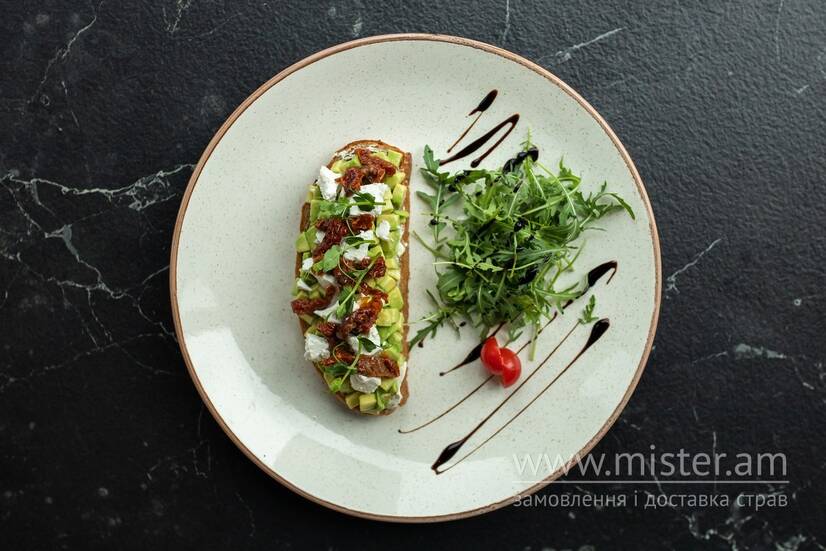 Тост з гречаного хліба власного виробництва, підсмаженого на грилі, крем-сир, авокадо, бланшеровані томати, сир фета, мікс салату з слайсами огірка, заправлений гірчичною заправкою.
