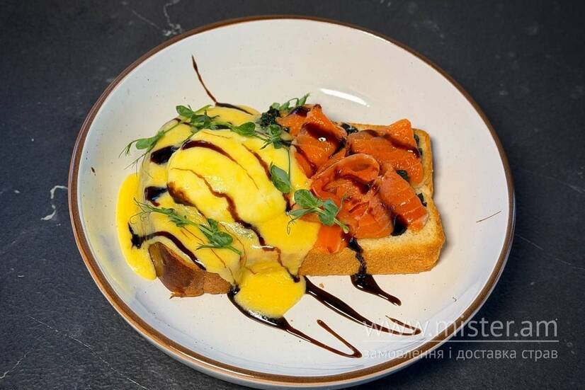 Сніданок на підсмаженому бріош із ніжним лососем, припущеним шпинатом та яйцем пашот доповнюється кремовим голландським соусом, що надає насичений вершковий смак.