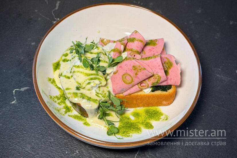 Яйце пашот, підсмажений бріош разом із тонкими слайсами ароматної мортаделли, припущеним шпинатом, кремовою страчателлою та соусом Дороблю.