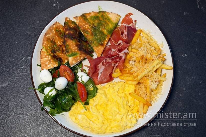 Хрустка фокача з соусом песто та ніжним хамоном, картоплею фрі, вершковим скремблом та капрезе.