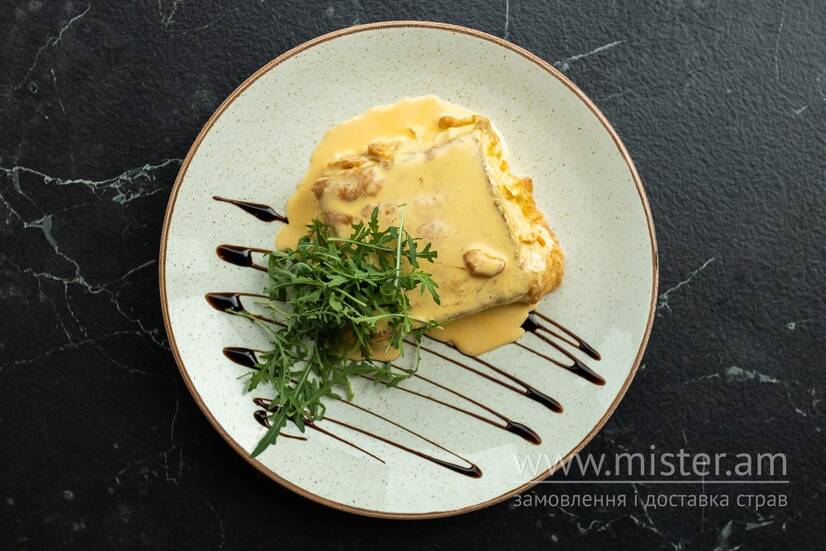 Хліб тостовий власного виробництва, шинка, томати,сир чеддер, залитий сирно-вершковим соусом. Подається з руколою та соусом песто.