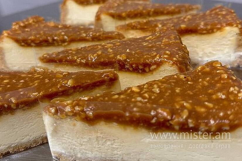 Пісочне тісто, сирна маса. Зверху солона карамель з кеш'ю.