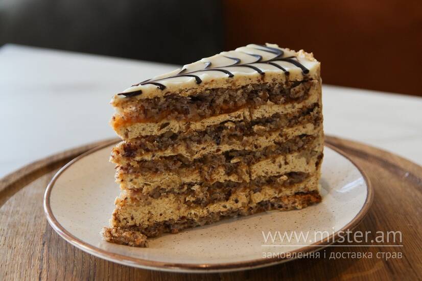 Білково-мигдальні коржі перемазані вершково-масляним кремом з додаванням двох видів згущеного молока, горіхи мигдалеві, залитий білим шоколадом прикрашений павутинкою з чорного шоколаду та мигдалевими пластівцями.