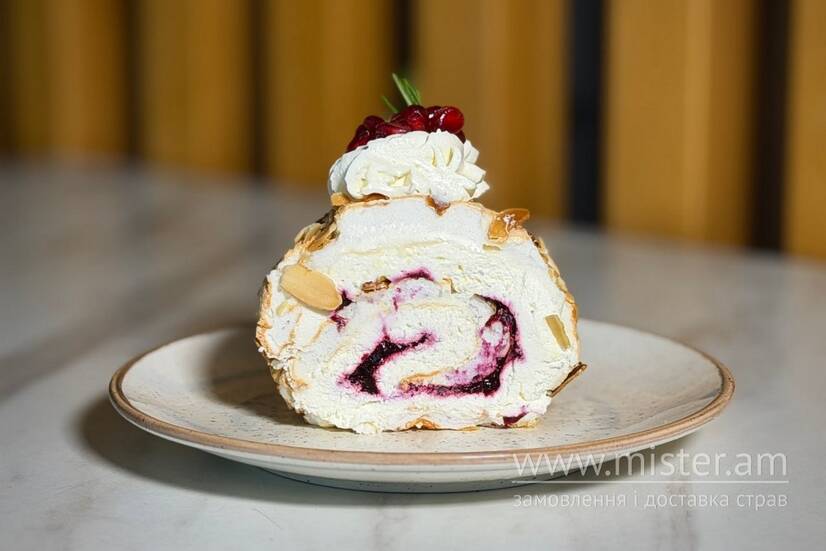 Меренговий рулет, крем чіз, конфі смородина. В декорі крем чіз, зерна граната та розмарин.