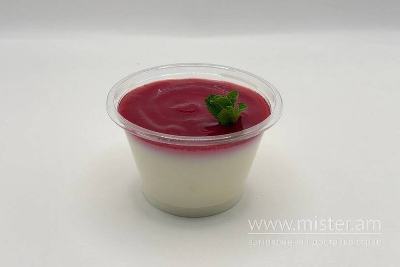 Молоко, вершки, цукор, ванільний цукор та желатин, малинове конфі та м`ята в декорі.