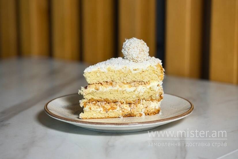 Кокосовий бісквіт, просочений кокосовим молоком, крем на вершковому сирі з додаванням кокосової стружки та хрустка основа (мигдаль, мигдалеві пластівці та біла шоколадна глазур).