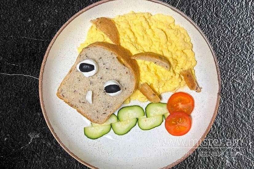 Дитячий скрембл з овочами та цільнозерновим хлібом власного виробництва.
