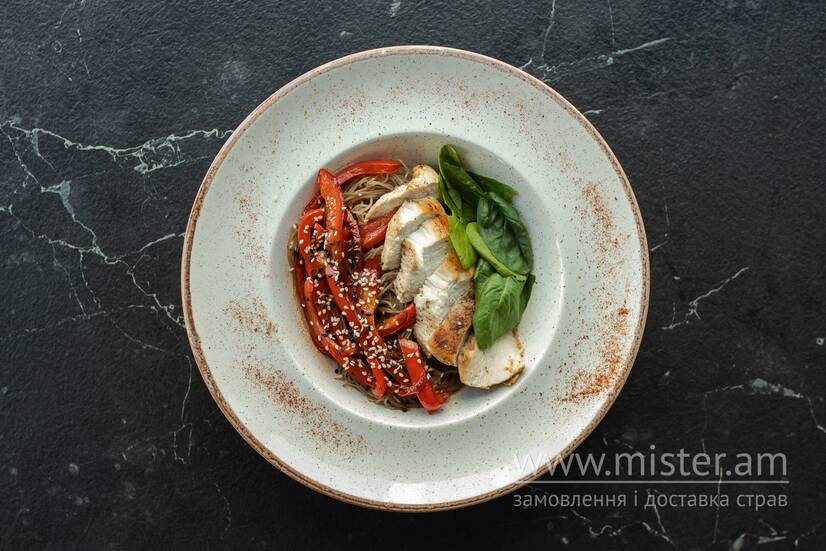 Мариноване запечене куряче філе, рисова локшина, перець болгарський, кунжут, шпинат.