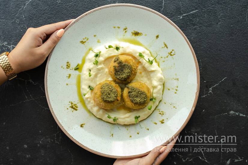 Картопляне пюре з додаванням пармезану, курячі котлети з додаванням сиру та соус песто з петрушки.