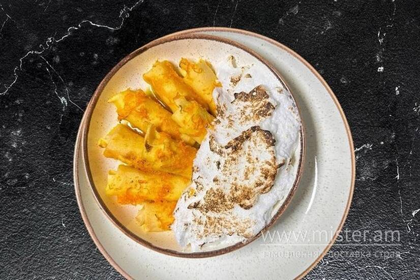 Ніжні млинці з повітряною творожною масою та солодкою меренгою, доповнені хрусткими горіхами кеш'ю. Подаються з ароматним цукрово-апельсиновим сиропом, що надає вишуканого смаку. Ідеальне поєднання ніжності, солодкості та легкого цитрусового акценту.