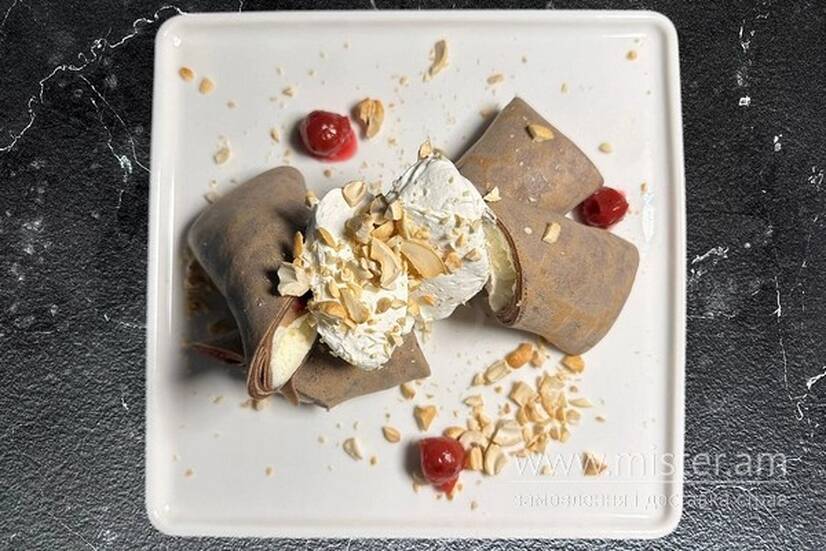 Апетитні шоколадні млинці з ніжною творожною масою, соковитими вишнями та повітряним вершковим кремом. Хрусткі горіхи кеш'ю додають вишуканої текстури, а легке посипання цукровою пудрою завершує цей ідеальний десерт. Ідеальний вибір для тих, хто любить поєднання насиченого шоколадного смаку з легкою кислинкою вишні.