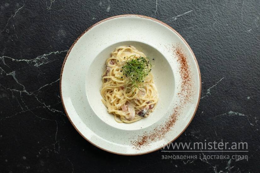 Класична паста з шинкою, беконом, сиром пармезан, заправлена вершковим соусом та білим вином.