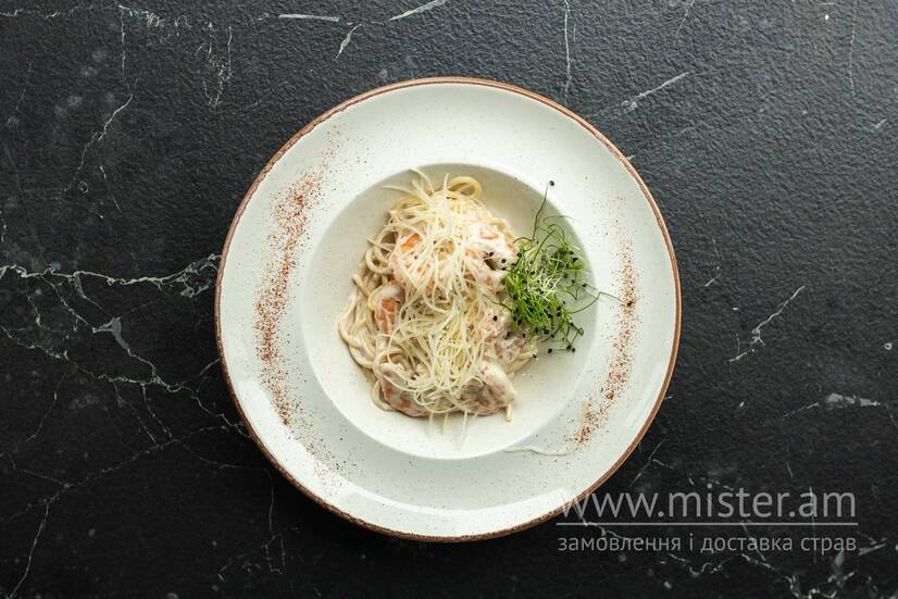 Паста з креветками у вершковому соусі з сиром пармезан, заправлена білим вином та соєвим соусом.