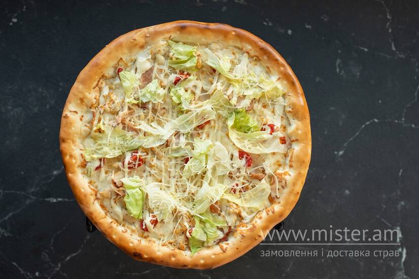 Піца на основі білого соусу з куркою, помідорами, сиром пармезан, беконом та салатом айсберг, соус Цезар.