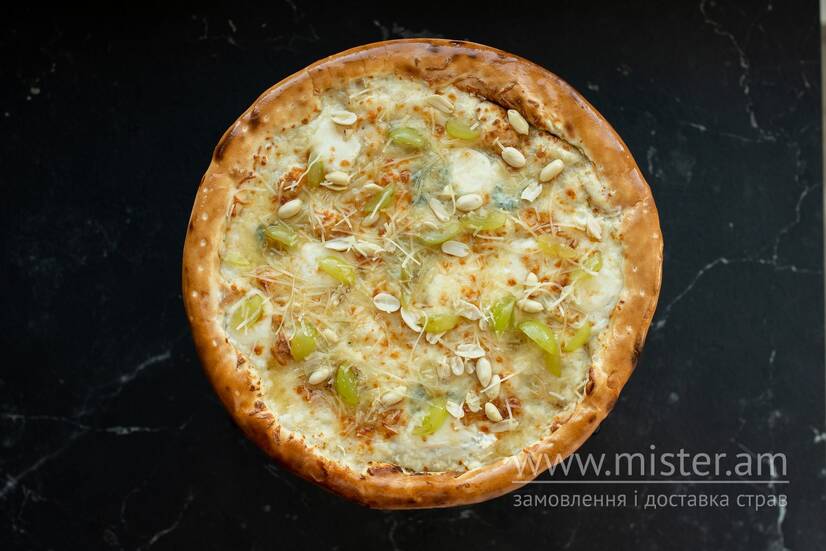 Піца на основі білого соусу та сирів бейбі-моцарелла, горгондзола, пармезану, меду, арахісу та винограду.