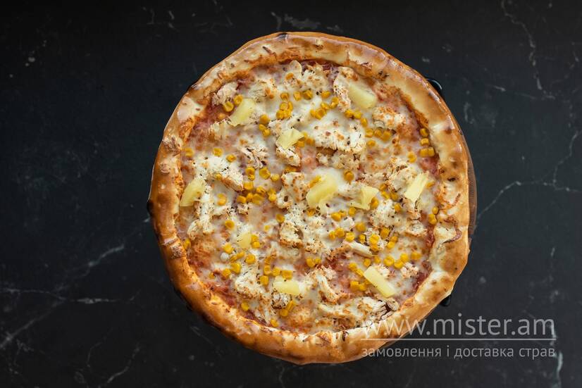 Піца на основі червоного соусу з вареною куркою, кукурудзою, ананасами та сиром моцарелла.