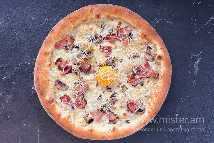На основі вершкового соусу, з додаванням шинки, печериць, з сиром пармезан та жовтком під сиром моцарела.