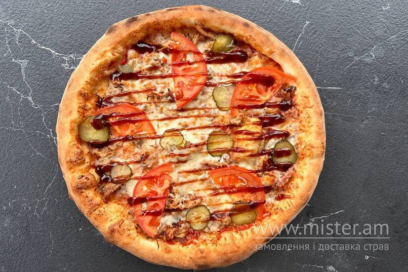 На основі томатного соусу, з додаванням свинини Кубанос з димком, маринованого огірка, соусу Барбекю під сиром моцарела.